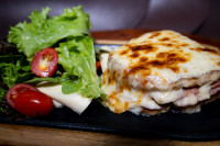 Pão de forma, queijo golda, presunto, gratinado. Acompanha salada de alface, rucula, tomate, palmito
