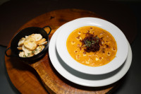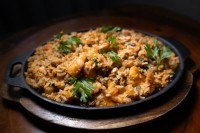 Arroz cremoso com feijão verde temperado com coentro, calabresa, cubos de peixe, camarões finalizado com queijo coalho crocante.
