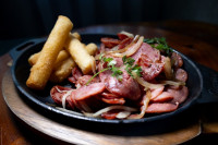 Carne de sol puxada na manteiga do sertão com cebolas. Servido com pirão de queijo coalho, arroz branco e farofa de jerimum com coentro.