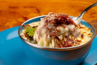 Bacalhau em lascas, cebola confitada, pimentões coloridos, azeitonas, batatas, coberto com creme e gratinado.